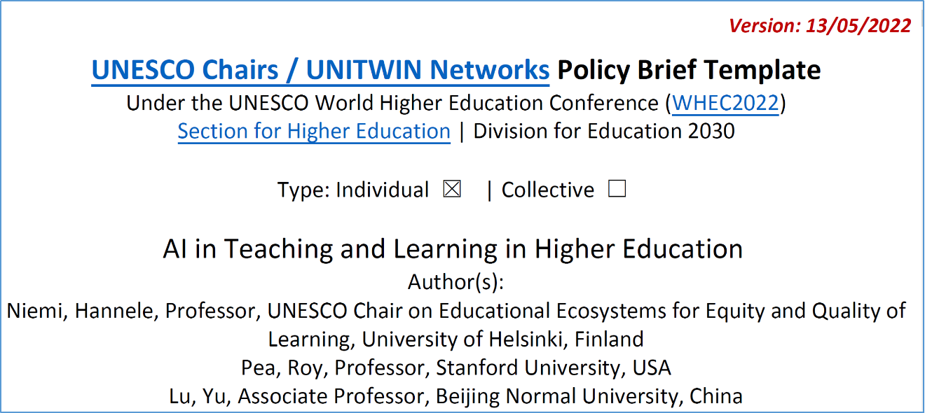recently, the policy brief “ai in teaching and learning in higher education” co-authored by associate professor lu yu, director of the artificially intelligence laboratory of the advanced innovation center for future education of beijing normal university (aicfe), professor hannele niemi from the university of helsinki, finland, and professor roy pea from ​​stanford university, usa, was officially released by the relevant conferences of the united nations educational, scientific and cultural organization (unesco).
