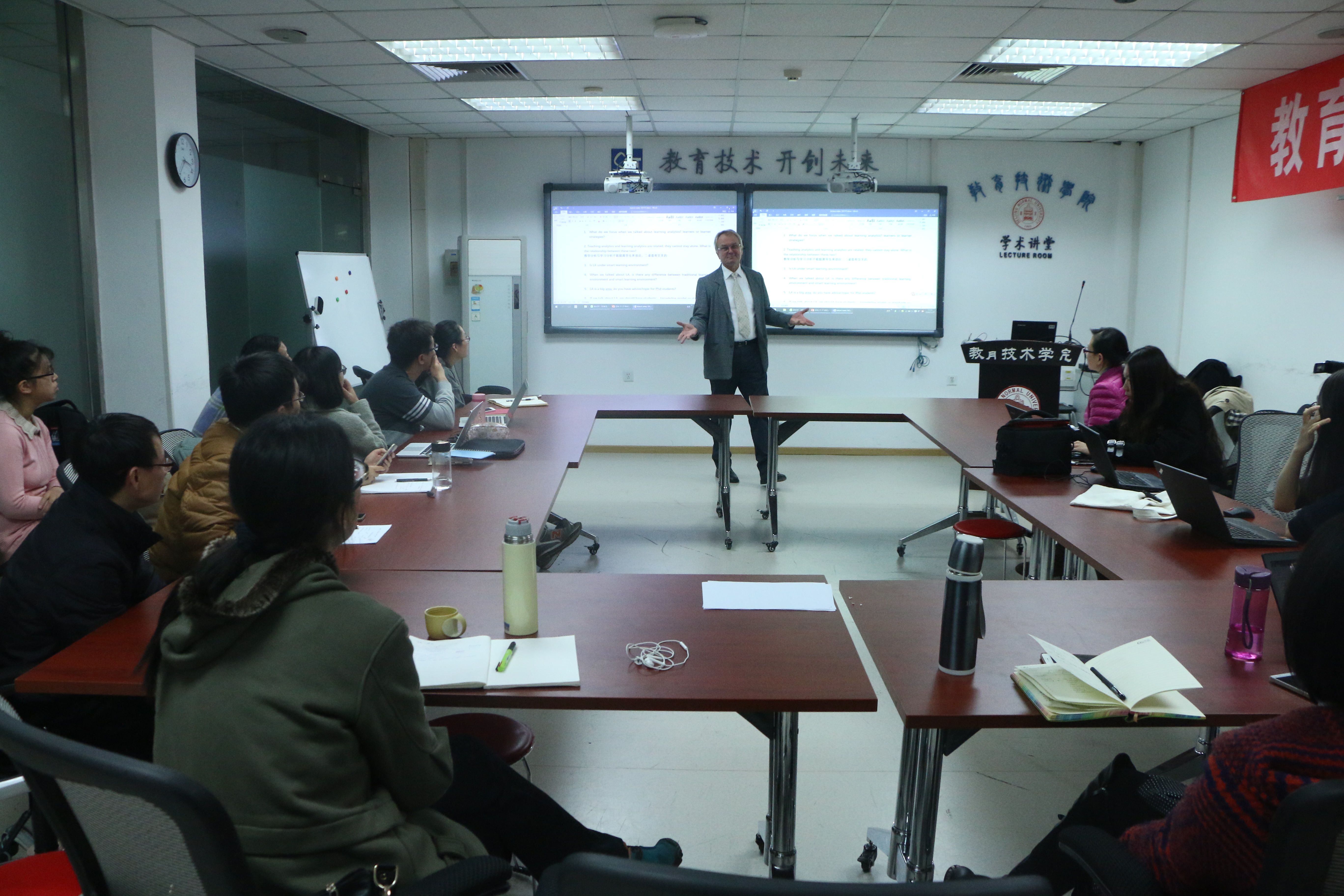 dr. jon mason from the school of education, charles darwin university in australia delivered a lecture titled questioning, smart education and learning analytics on november 17 at school of educational technology, beijing normal university (bnu). this lecture is under series lectures on future education and was organized by beijing advanced innovation center for future education (aicfe). this lecture was in room 208 at school of educational technology instead of a meeting room at aicfe, because we intended to share cutting edge researches with faulty and staff and students at bnu. the lecture attracted around 30 audience, including staffs at aicfe, students and international students at bnu, and teachers from middle schools. the most impressive activity for audience was a mini workshop on question formulation technique. thirteen questions arose in 10 minutes around ‘learning analytics’. this workshop reminded us that ‘why’ is intriguing and essential.