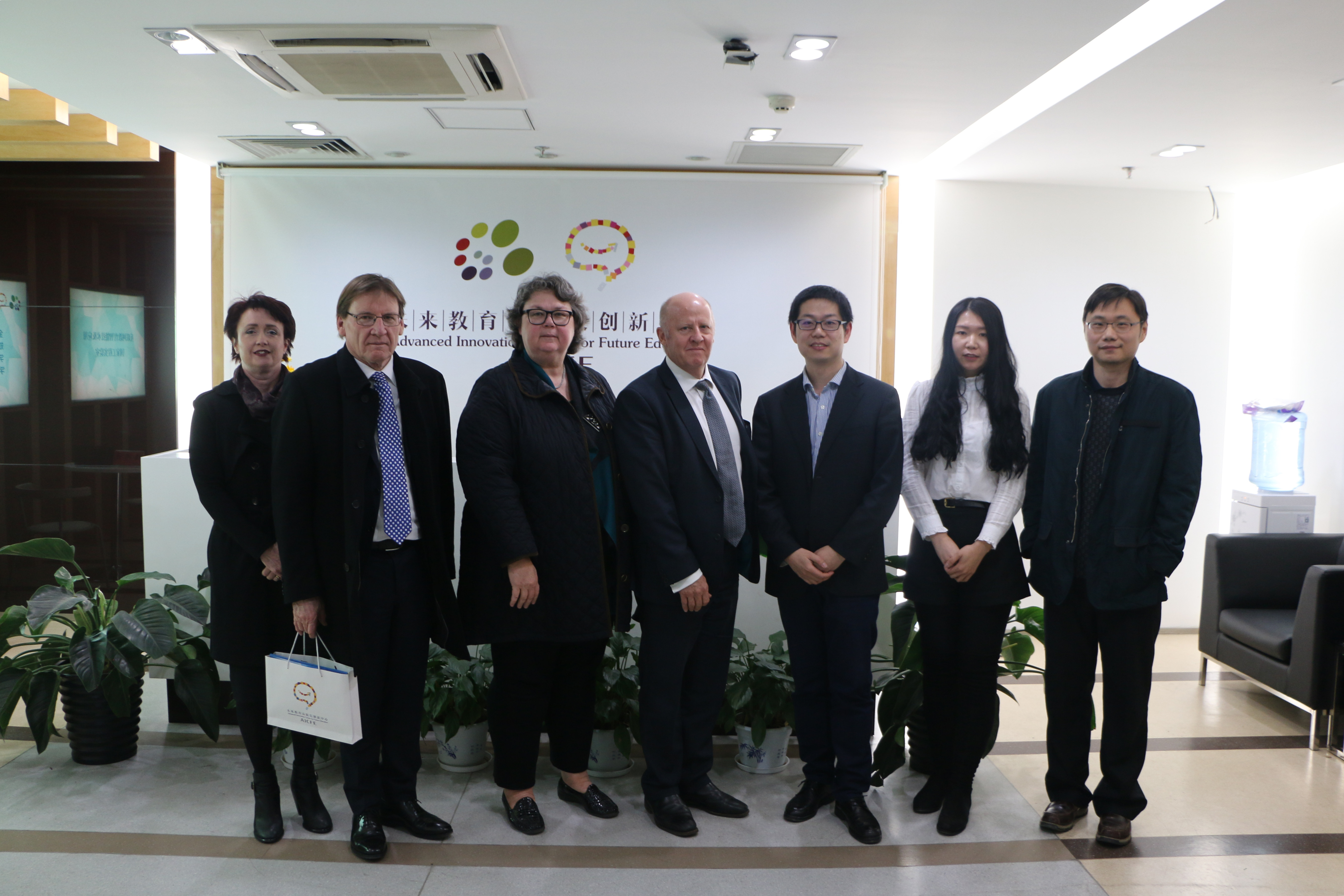 the delegation of queensland university of technology (qut) visited the advanced innovation center for future education (aicfe) on the morning of november 16, 2017. the high-level delegation is composed of prof. peter coaldrake, the vice-chancellor & president of qut, prof. scott sheppard, deputy vice-chancellor of the university, prof. carol nicoll, executive dean of the faculty of education, ms. kathie thomson, vice-chancellor’s office, and ms. jacqueline yuan, international engagement coordinator.