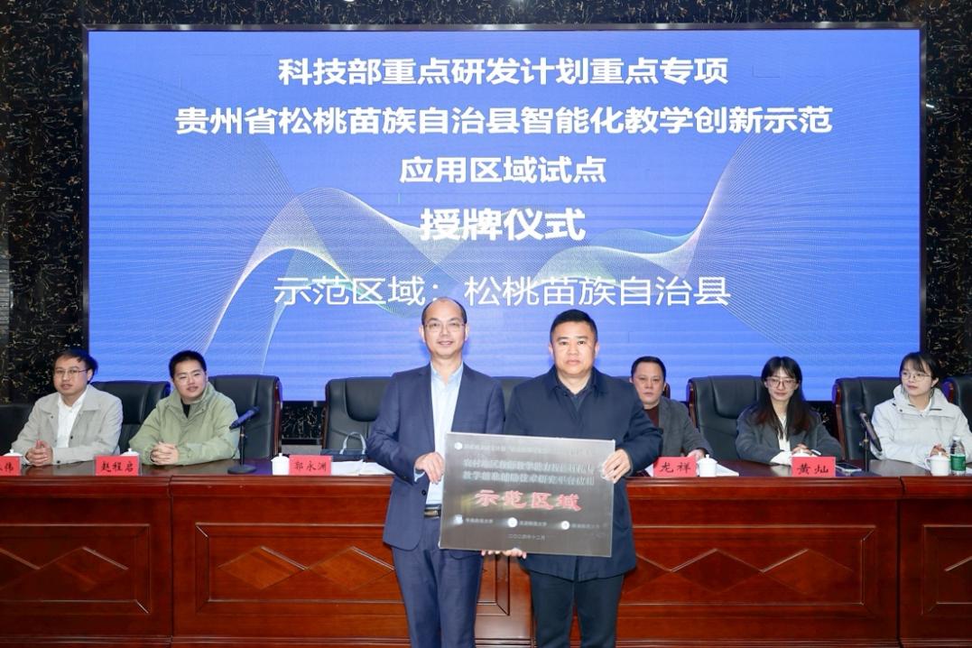 then, the project team held a awarding ceremony with the demonstration area. huang ziqian, the representative of the general project team and the associate professor of south china normal university, signed a contract with guo yongyuan, the director of the teaching and research section of the education bureau of songtao miao autonomous county, and awarded the "demonstration area" plaque to the county.