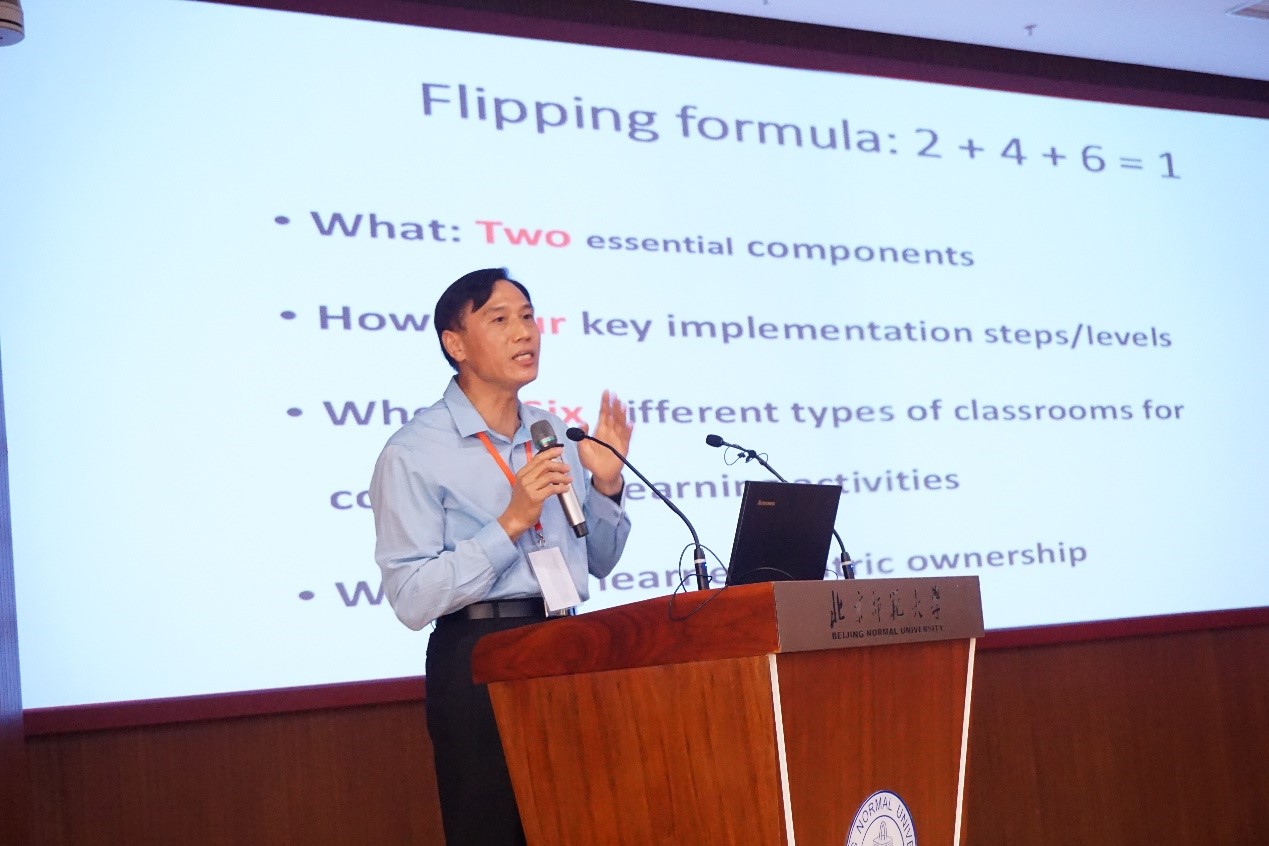 on the morning of june 6th, prof.   nian-shing chen, department of information management at national sun   yat-sen university in taiwan, made a keynote speech entitled "flipped   classroom teaching and learner autonomy." he described the concepts,   designs and implementation strategies   of flipping courses. first, he explained the significance of the two   parts of the course: pre-recorded interactive video lectures and highly   interactive learning activities. in addition, he also mentioned  teachers  can teach in six different types of venues, including physical   classrooms, asynchronous cyber classrooms, synchronous cyber  classrooms,  mobile classrooms, social classrooms and ubiquitous  classrooms. in the  implementation phase, he proposed a four-stage  systematic approach to  help teachers to effectively conduct an flipping  course. these four  stages are designing learning content, leading  learning activity,  guiding students with specific learning  difficulties, and managing good  learning atmosphere across multiple  learning spaces.
