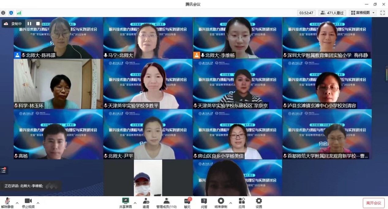 会议邀请到了北京师范大学副教授、硕士生导师、教育技术学院书记、“移动学习”教育部-中国移动联合实验室副主任马宁作为专家进行点评总结;邀请了首都师范大学附属回龙观育新学校小学科学教师曹春燕,广东南山深圳大学附属教育集团实验学校语文教师、深圳市优秀教师梅伟静作为特邀分享嘉宾来分享自己的优秀案例;会议还请到天津英华实验学校初中数学高级教师李胜平、天津英华实验学校小学信息技术教师高杨、天津英华实验学校东丽校区小学数学教师辛京京、广东省广州市荔湾区芦荻西小学科学高级教师林玉环、北京市房山区良乡小学数学教师杨美佳、北京师范大学硕士尹平、北京师范大学硕士高云云、广东省广州市荔湾区乐贤坊小学副校长杨国超、四川省泸州市泸县玄滩中心小学科学教师刘清容做案例和论文的分享,同时不同区域的中小学校长、骨干教师及教育界同仁们都参加了本次线上会议。本场会议腾讯网络研讨室中的累计观看人数为471人,2.50k点赞数;classin平台直播累计观看共计4900人次。