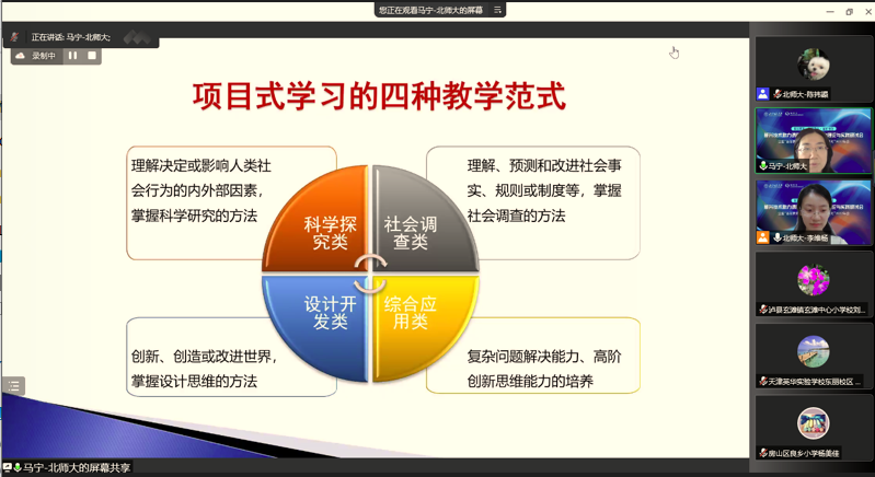 马宁首先肯定本场以学科实践活动、跨学科整合、项目式学习等教学实践为主题的分享质量,课例和论文充分体现了实践育人、跨学科育人的素质教育理念,以提升学生的问题解决能力、创新能力等核心素养为目标,在实践中取得丰硕的成果和宝贵的经验。随后马宁介绍了项目式学习的四种教学范式,为教师设计与开发项目式学习提供一些参考,同时也强调了两个方面:一是希望各级教育工作者在未来的项目式学习等教学实践中不拘泥于个案的开发,注重高站位、系统性地对待课程体系的建设和开发;二是应当在信息技术与教育教学的深度融合中,充分发挥信息技术优势,拓展相关领域的研究和实践。