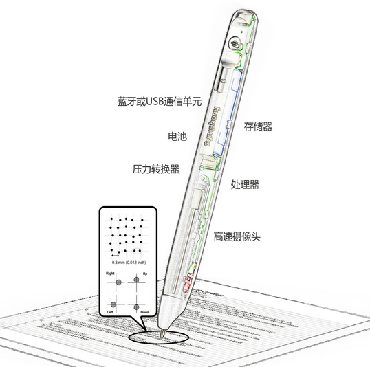 光学点阵技术:在普通的纸张上印上一层不可见的点阵图案,数码笔前端的高速摄像头随时捕捉笔尖的运动轨迹,同时压力传感器将压力数据传回数据处理器,最终将信息通过蓝牙或usb线向外传输),原理见下图。