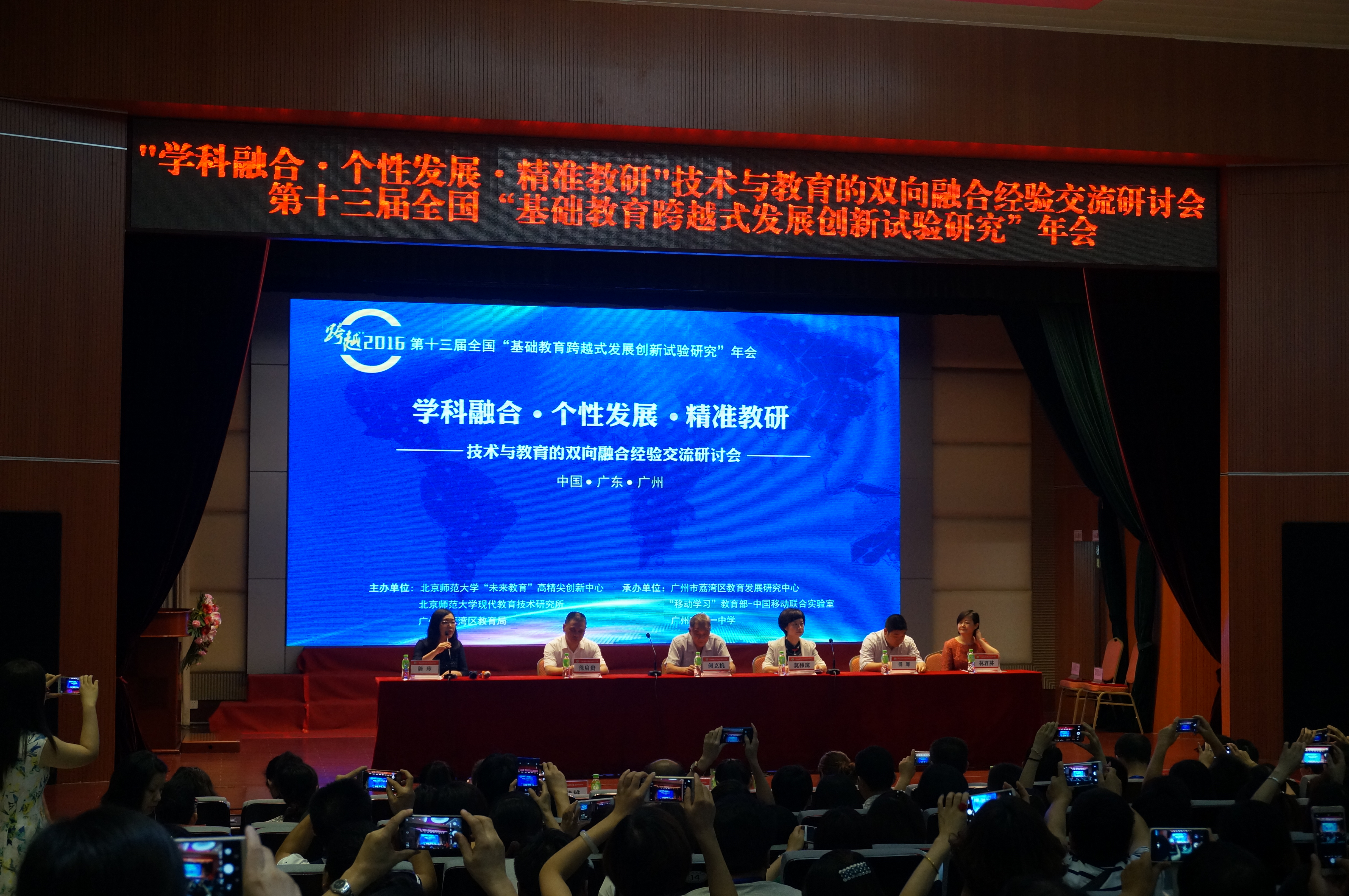 2016年7月12日-15日,以“学科融合·个性发展·精准教研”为主题的技术与教育双向融合经验交流研讨会在广州市举办。本次研讨会由北京师范大学未来教育高精尖创新中心、北京师范大学现代教育技术研究所、广州市荔湾区教育局主办,广州市荔湾区教育发展研究中心、“移动学习”教育部—中国移动联合实验室承办。北京师范大学未来教育高精尖创新中心以及来自安徽、北京、河北、新疆、甘肃、贵州、广东等10多个省市的800多位教育领导、一线教师参加了此次会议,本次会议为围绕“学科融合、个性发展、精准教研”邀请了相关领域的专家学者进行专题讲座,并以现场课的形式更直观地进行荔湾教育成果展示,在总结成果经验的基础上分享最新研究成果,畅想未来发展趋势,更好地推进“互联网”时代下教育的创新发展。