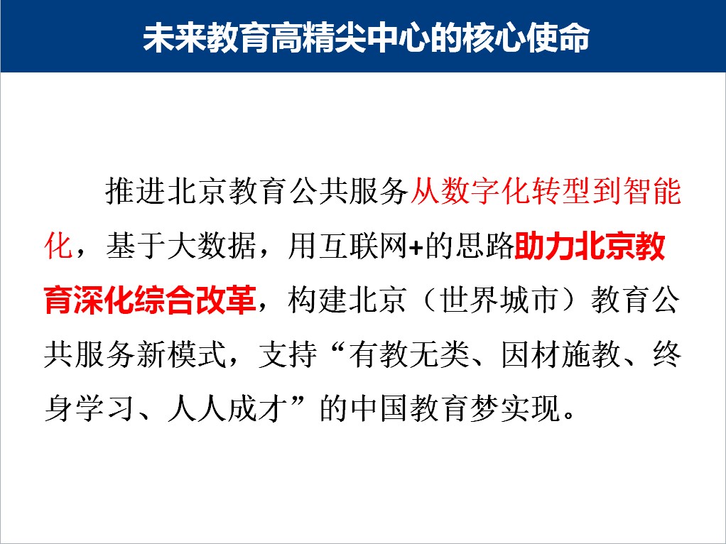 2016年11月11日,北京师范大学副校长陈丽教授、未来教育高精尖创新中心执行主任余胜泉教授赴北京市教委,参加“北京高校高精尖创新中心工作汇报会议”。来自清华大学、北京大学、北京师范大学、北京理工大学等高校的9个高精尖创新中心的负责人和代表参加会议,并在会议上进行工作交流。北京市教委刘宇辉主任、叶茂林副主任听取了中心余胜泉主任的汇报,包括中心和学校的制度建设情况、中心建设工作进展以及中心近期远期建设预期等。