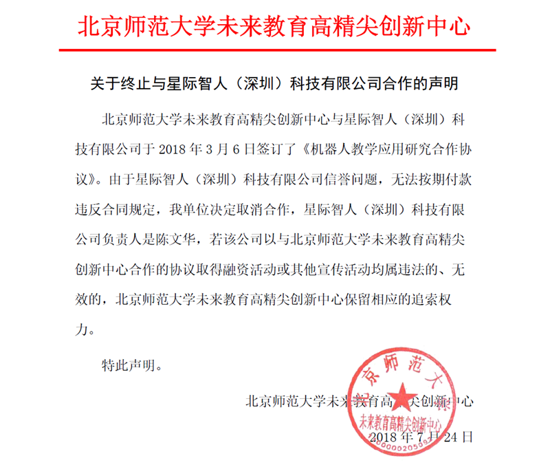 关于终止与星际智人(深圳)科技有限公司合作的声明