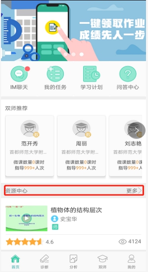 第二步:在安信11娱乐平台首页的“资源中心”点击“更多”,与电脑端设置一致,学生可根据个性化学习需求,对学科、教师姓名、学科核心概念、微课资源的评分和更新进度情况对平台所有微课资源进行筛选,从而点击选中的课程进行在线学习。