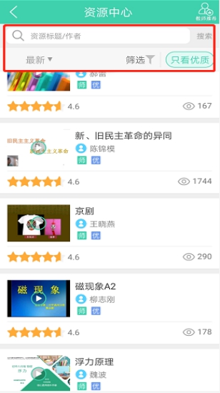 第二步:导航栏点击“资源中心”,学生可根据个性化学习需求,对学科、教师姓名、学科核心概念、微课资源的评分和更新进度情况对平台所有微课资源进行筛选,从而点击选中的课程进行在线学习。