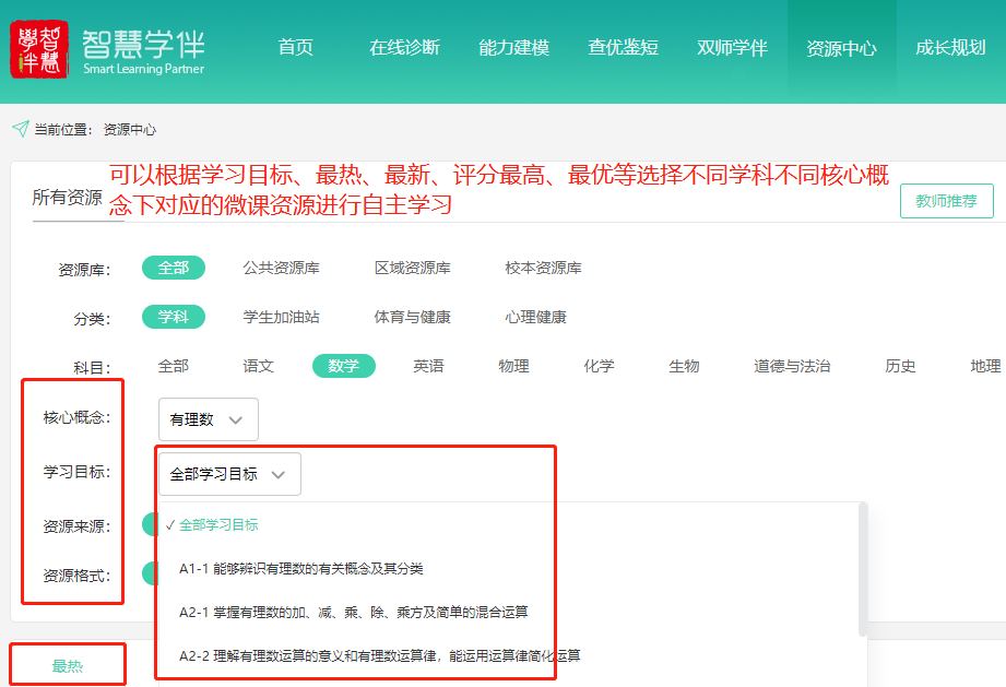 智慧学伴平台汇聚初、高中学段语文、数学、英语、物理、化学、生物、历史、地理、政治(道德与法治)等九大学科15000多个短小精练的微课资源,覆盖中学阶段所有必备知识点。系统会根据学生知识掌握的情况,自动给每个学生推荐学习资源,教师也可以将资源定向推荐给有相关学习需求的学生,平台支持教师跟踪学生学习进度。