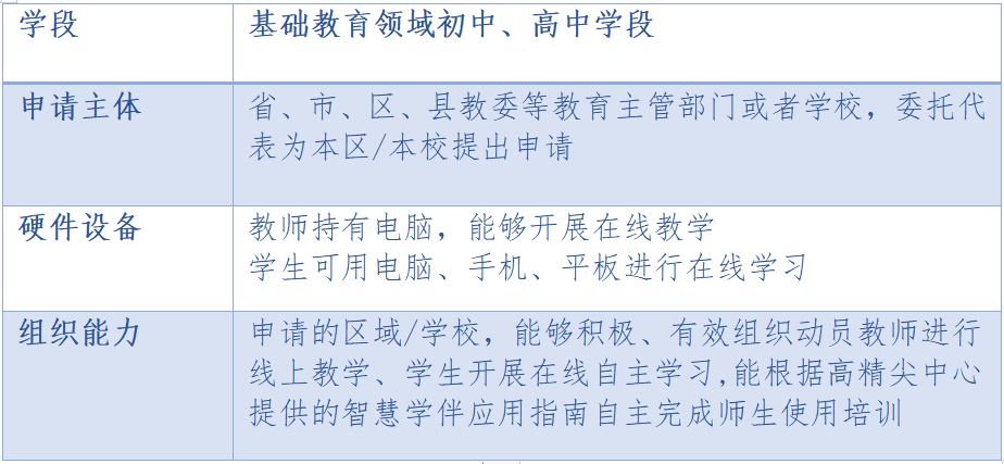 智慧学伴目前有完整的初中、高中学段的学习资源,欢迎全国各地初高中学校整体申请加入。具体说明如下表: