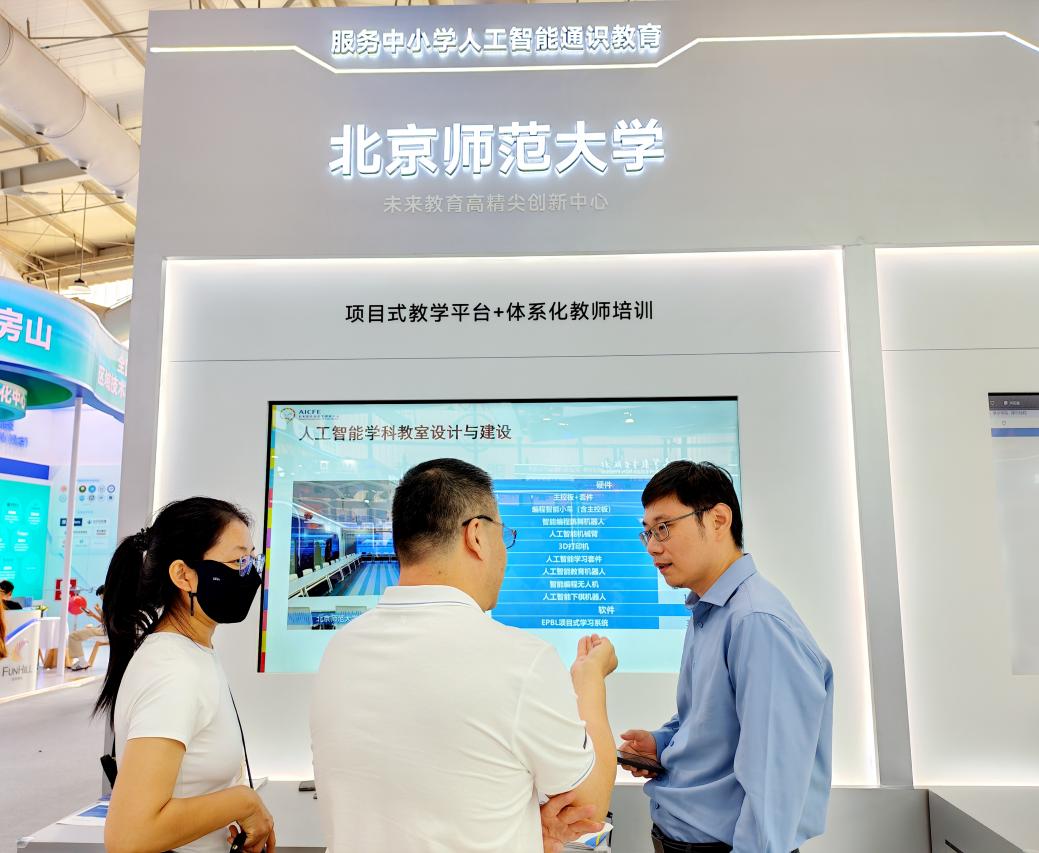 展会上,来自北京市领导、全国各地的中小学教师等教育专业人士以及家长、学生对北师大高精尖中心展区表示了积极关注和肯定。北京市委教育工委副书记、市教委主任李奕莅临展区指导并听取了高精尖中心的中小学人工智能通识教育安信11娱乐平台的解决方案,对方案中的项目式教学平台与《人工智能学科教师素养提升》配套用书表示了肯定。