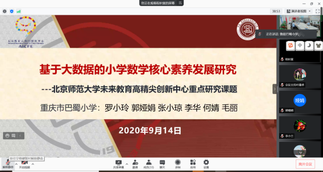 2021年9月14日下午,北师大高精尖中心联合重庆市巴蜀小学组织了“基于大数据的小学核心素养发展研究”课题开题答辩会,四个学科教育类别课题研究团队以语文、数学、英语、科学的学科顺序依次开启答辩,巴蜀小学校长马宏、副校长李永强、巴蜀园执行校长令狐林作为课题组支撑团队为答辩老师们提供了有力的后备支持。北师大高精尖中心学科教育实验室常务主任李晓庆,学科教育实验室主任崔京菁,学科教育实验项目主管张雪玉联袂出席,作为此次开题答辩的评审专家组为研究组老师的答辩汇报进行开题指导。